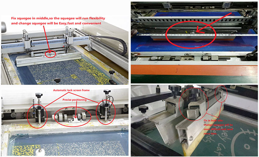 2、完美的印花刮印座一體化設計,上下裝缷網版快速、簡便,更換不同花版、花版檢查對版可直接快速目視調整;加漿料方便,無障礙,不損花版,獨特的網板對位系統,上、下、左、右定位。網板快速定點裝卸操作方便。